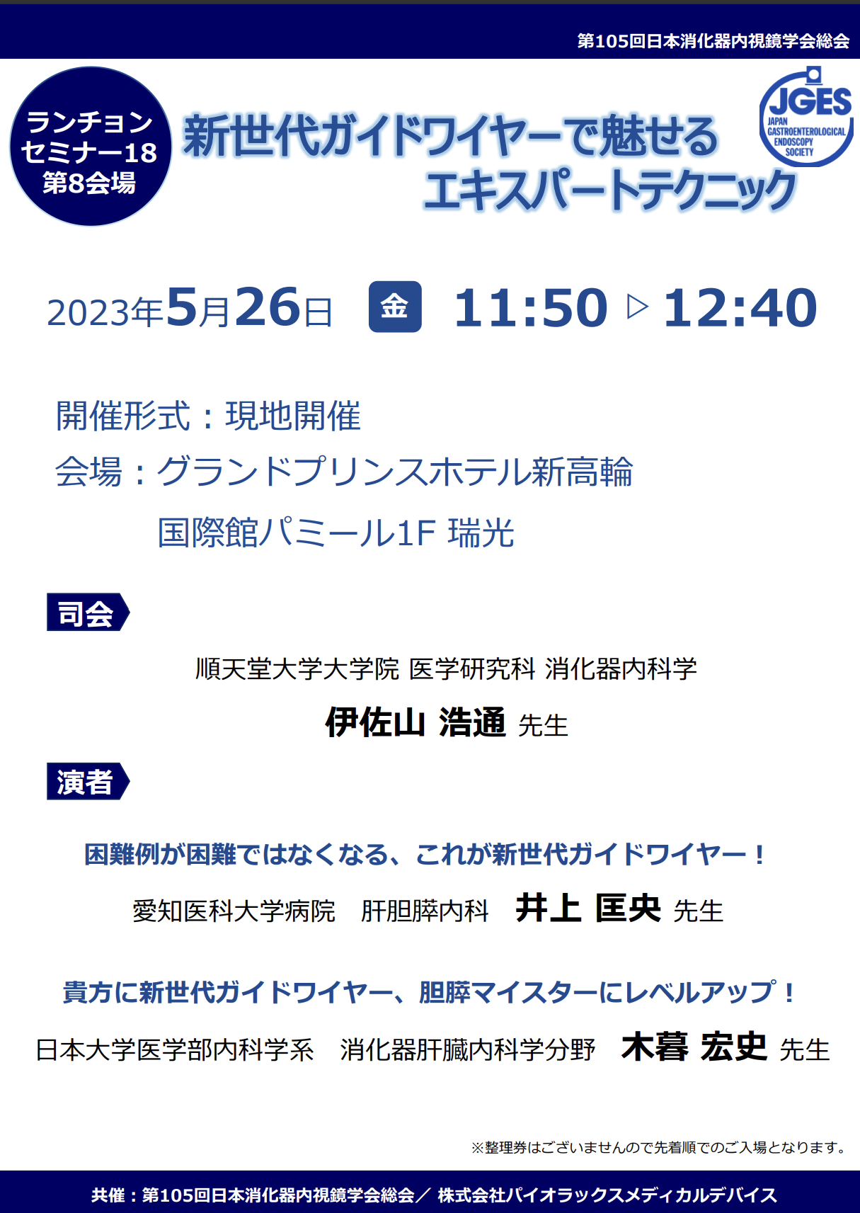 2023年5月26日(金) 井上匡央准教授が「第105回日本消化器内視鏡学会 ランチョンセミナー」にて講演を行います。